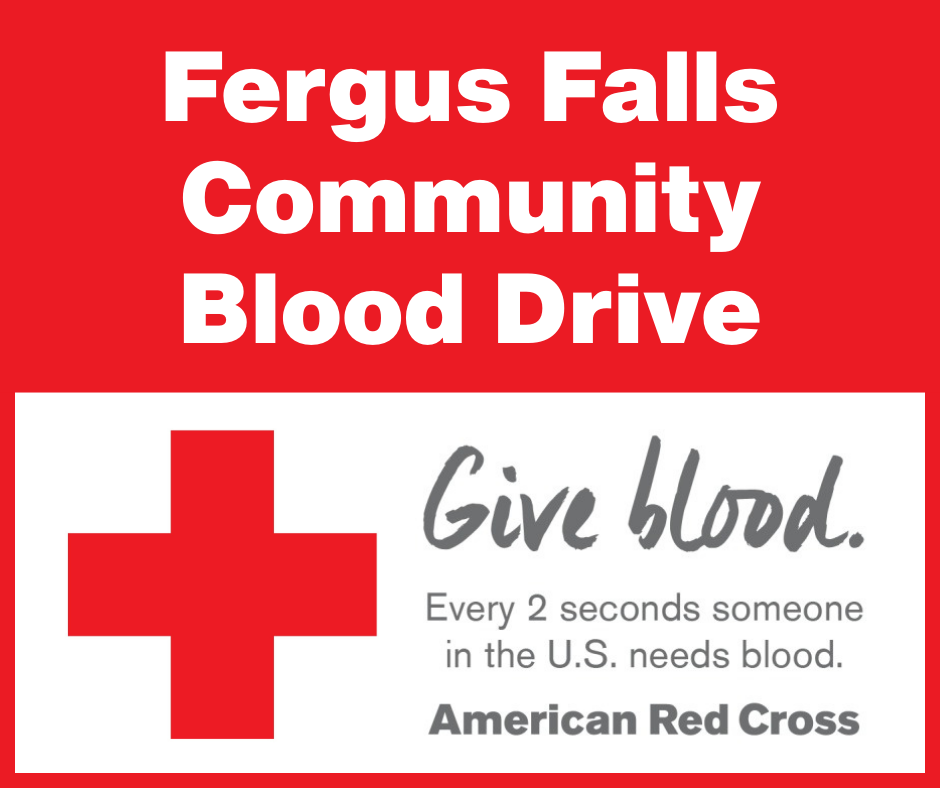 The Fergus Falls Community Blood Drive will be held Wednesday, January 14 and Thursday, January 15 from 12:00–6:00 p.m., and Friday, January 16 from 8:00 a.m.–1:00 p.m. at the YMCA of the Northern Sky, 1164 Friberg Ave., Fergus Falls. Schedule an appointment using the Red Cross Donor App, call 1-800-RED CROSS
