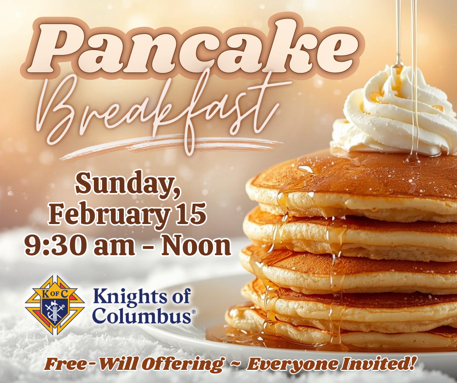 Join us on Sunday, February 15, from 9:30 a.m. to Noon at OLV for a Knights of Columbus Pancake Breakfast. A free-will offering will be accepted. All are invited!