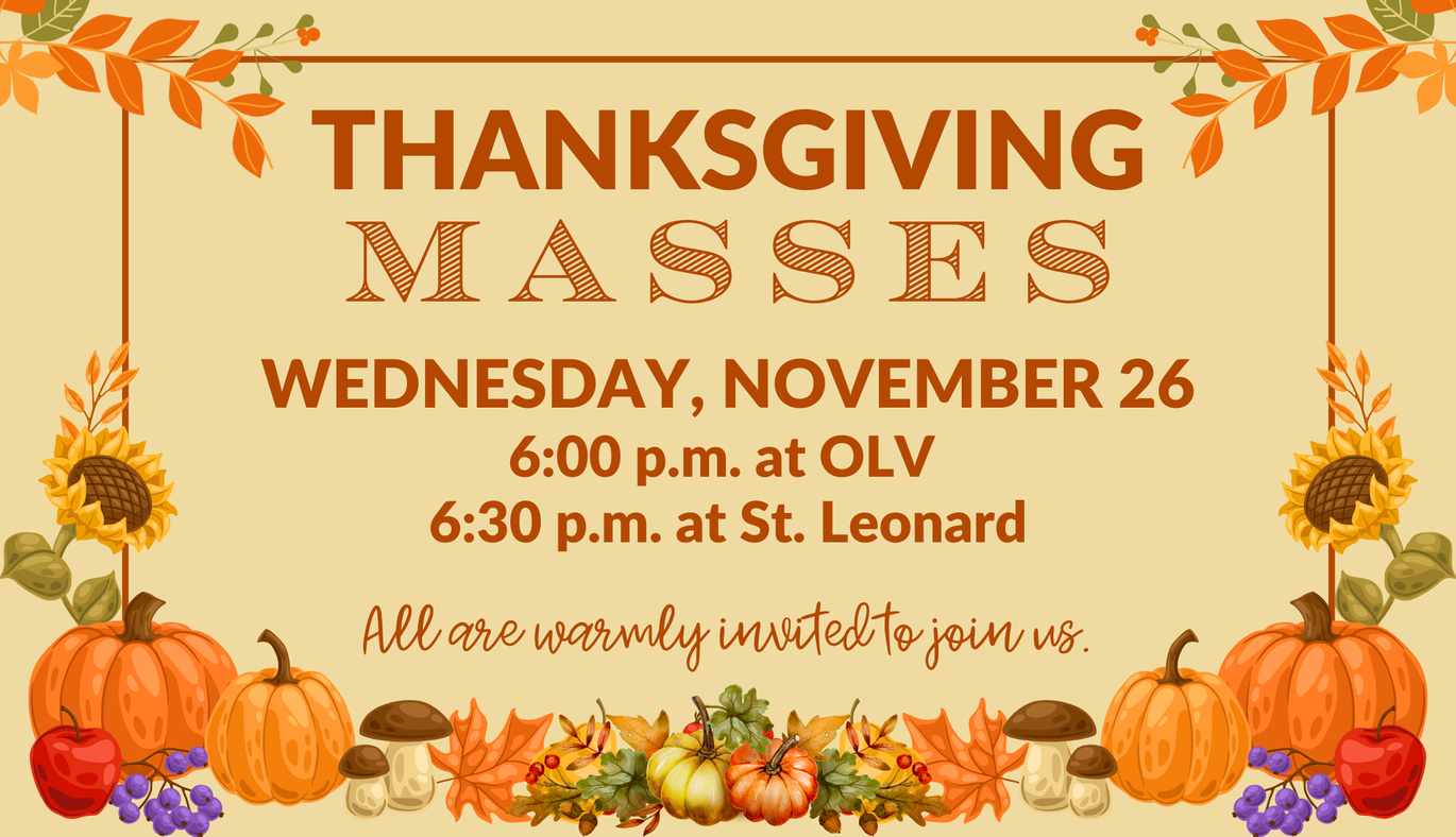Thanksgiving Masses will be celebrated on Wednesday, November 26. Join us at 6:00 p.m. at Our Lady of Victory or at 6:30 p.m. at St. Leonard. All are welcome!